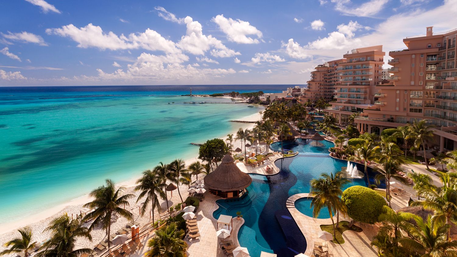・カンクンの中でも老舗の大型ホテル、コーラルピンクの外装が特徴的なオールインクルーシブホテル
