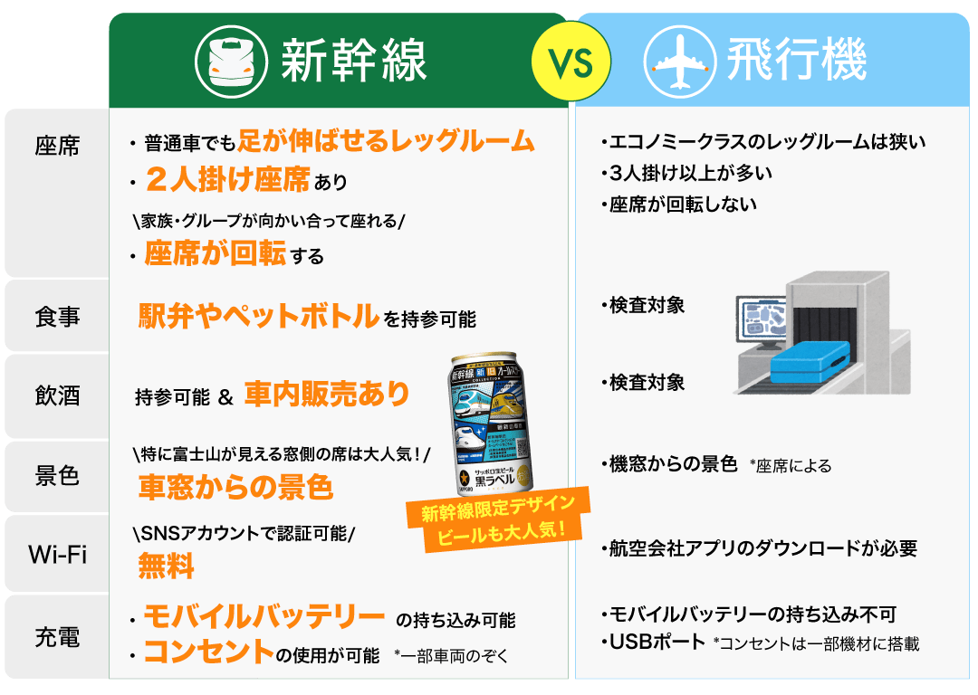 広々としたレッグルーム、無料Wi-Fi、向かいあって座れる座席、自由な飲食、そして車窓からの景色も最高! 新幹線での旅行は、単なる移動手段にとどまらない「旅の大切な思い出」になります。