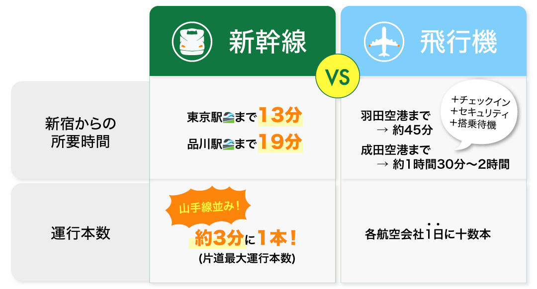 飛行機搭乗やその後のJRへの乗り継ぎなど総合的な時間と比較するとJRは超時短!