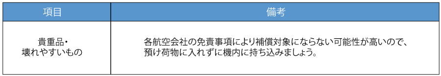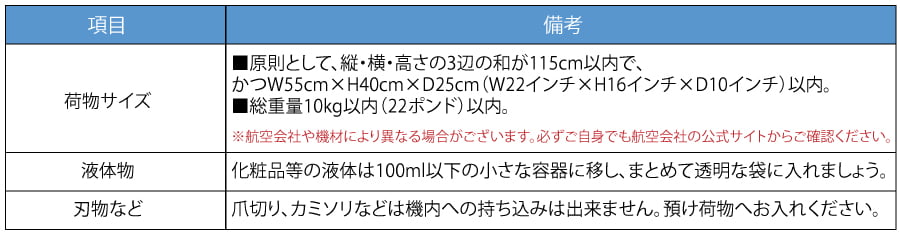 航空法により、預け荷物または機内持ち込みが禁止されているものがあります。(発火性・引火性のある危険物など) 特に、携帯型充電器のモバイルバッテリーは預け荷物にいれる事は禁止されてるので、必ず機内持ち込みにしましょう。