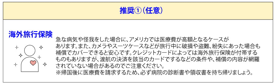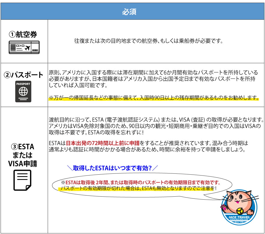| 事前準備 | - コロナウイルスに関する水際措置の解除 - 渡航前の事前準備 - アメリカ行き路線・搭乗時のご注意 |